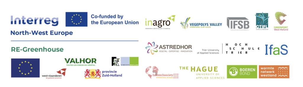 Inagro (BE), Boerenbond (BE), FarmTech Society (BE), Vegepolys Valley (FR), CTFL- Interprofessional Technical Centre for Fruit and Vegetables (FR), Astredhor (FR), IFSB- Construction Sector Training Institute (LU), Greenport West-Holland (NL), The Hague University of Applied Sciences (NL), Heat Grid Westland (NL), Trier University of Applied Sciences – Ifas- Institute for Applied Material Flow Management (DE).